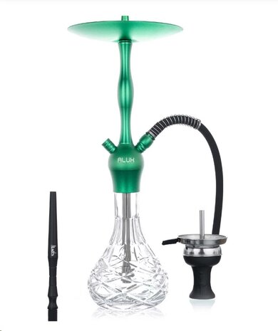 Ontzettende mooie shisha met een chique kristallen vaas en groene waterpijponderdelen zoals de schacht en de as schaal. De waterpijp heeft een zwarte waterpijpslang met mondstuk en een zwarte kop. Al met al een plaatje voor een zacht prijsje! - Merk: Aladin Alux - Hoogte: 50cm zonder kop gemeten - Aluminium groene schacht - 1x Siliconen slang met aluminium handvat - Slang bevat veer tegen knikken - Incl. Optimus kop en mockingbird opzetstuk - Incl. Kolentang - Er kunnen luchtbellen in het glaswerk zitten.