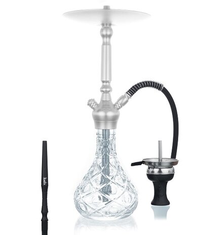 De waterpijp van Aladin, Alux M5 van Aladin is een ontzettende mooie waterpijp met een chique kristallen vaas en zilverkleurige waterpijponderdelen zoals de schacht en de as schaal. De waterpijp heeft een zwarte waterpijpslang met mondstuk en een zwarte kop. Al met al een zeer complete waterpijp met een luxe uitstraling. De alux shisha heeft een handige kliksluiting, hierdoor is montage en demontage zeer makkelijk. Het model is eventueel uit te breiden, naar een waterpijp met 2 slangen! - Merk: Aladin - Hoogte: 47cm (gemeten zonder kop) - Aluminium zilveren schacht - Siliconen slang met aluminium handvat - Slang bevat veer tegen knikken - Incl. Optimus kop en mockingbird opzetstuk - Incl. Kolentang - Kan eventueel uitgebreid worden met extra slang! (niet meegeleverd) - Er kunnen luchtbellen in het glaswerk zitten.